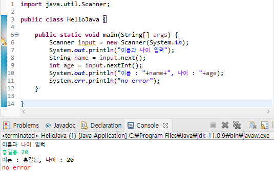 콘솔에 표준 출력하기 위해 클래스 System의 필드 out을 사용합니다. 클래스 System은 기본 패키지인 java.lang에 속하며, 소속변수 out은 static한 필드이므로 그대로 System.out을 사용할 수 있습니다. 클래스 System의 필드는 err, in, out 3가지가 있습니다. 이클립스에서 System.err를 사용하여 출력하면 붉은 색으로 출력됩니다.